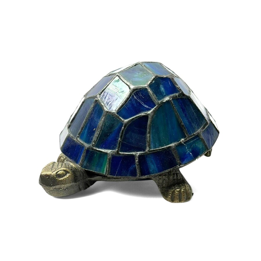 Een 20e eeuws lampje in de vorm van een schildpad, met glas-in-lood kapje.