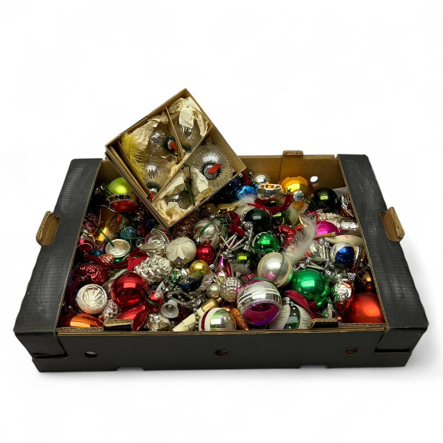 Groot lot ouide kerstversiering. Veel glazen kerstballen, met daarbij ook diverse figuren, zoals kerstman, vogeltjes, paddestoelen etc.