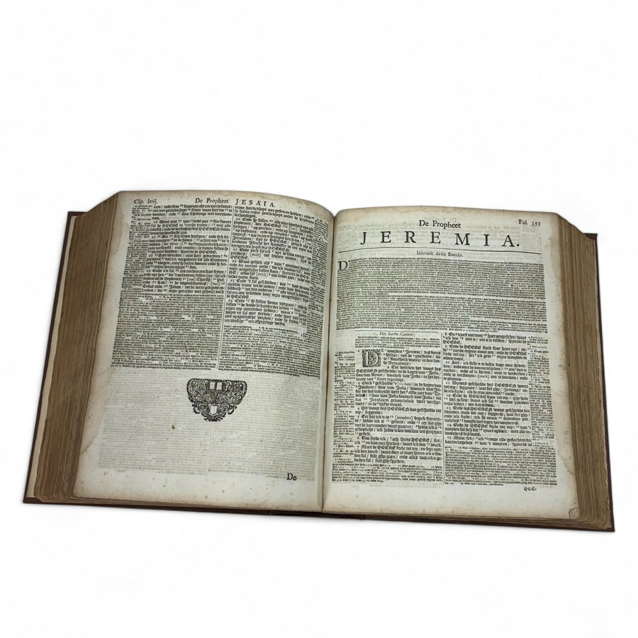 Een 18e eeuwse statenbijbel, . Uitgave van Utrecht in 1746, met gravure op het titelblad. Opnieuw in gebonden in een linnenband.