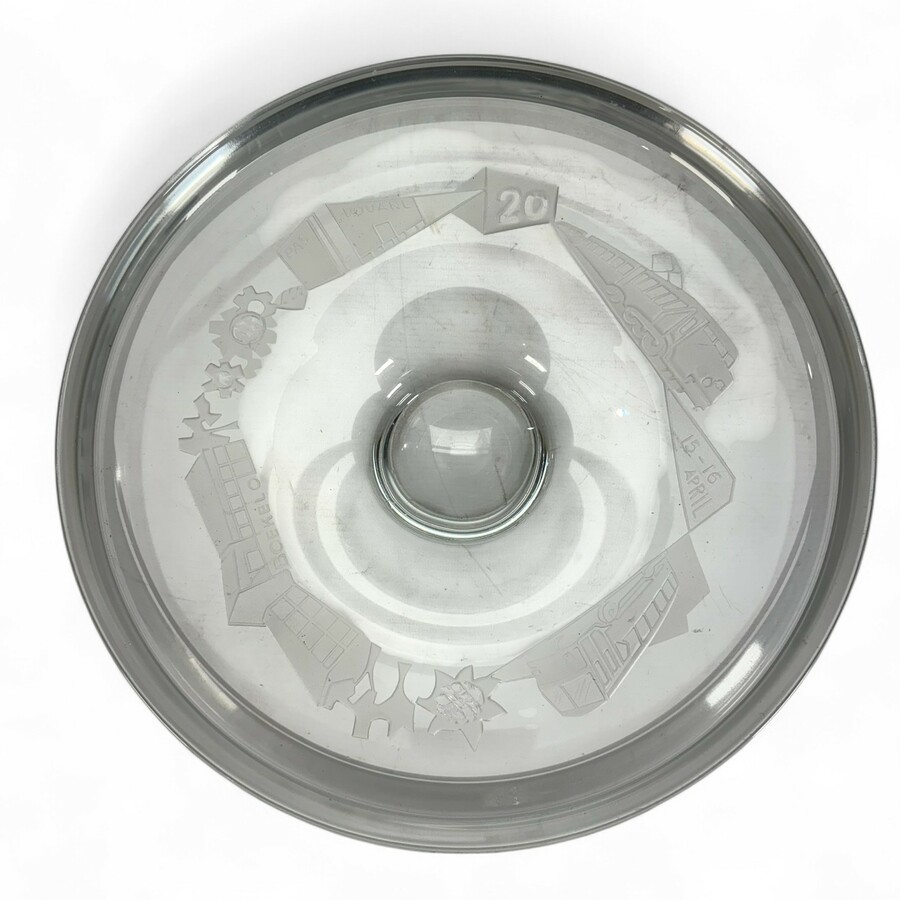 Een dikwandige Leerdam glazen schaal, 33cm doorsnede en 7 cm hoog. Met gegraveerde afbeedingen van een trein, autobus, douane kantoor. Met inscriptie 15,16 april 20 en tekst Boekelo. Vervaardigd...
