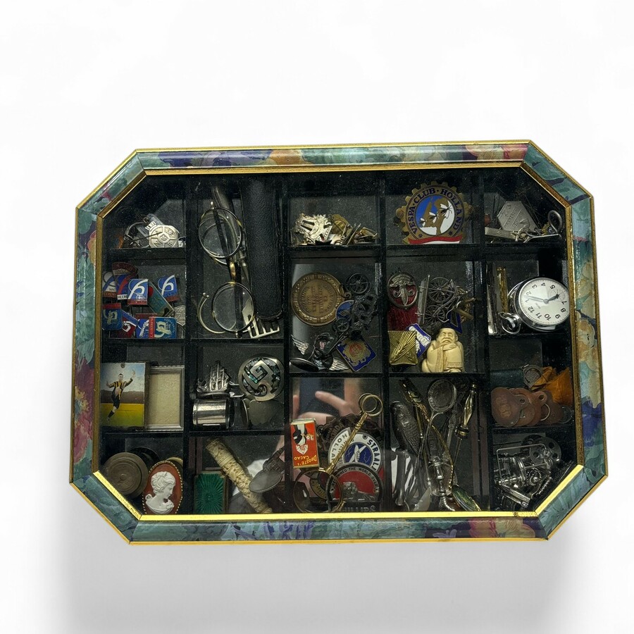 Een achtkantig vitrine kastje met diversen. Waaronder speldjes, naaldenkoker, bril in etui etc.