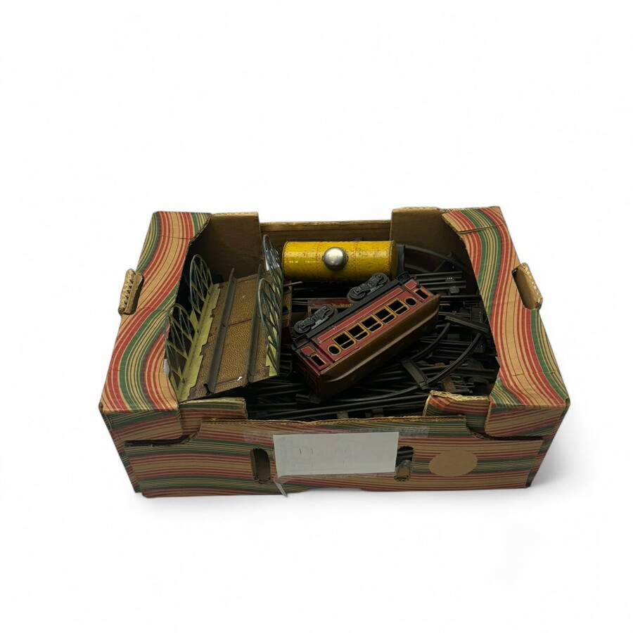 Johan Distler Nürnberg (1895-1968) rails en enkele wagonnetjes. Gemerkt JDN, Germany. Bestaand uit een Shell wagon, salon en kolen wagen. Hierbij brugdelen en rails.