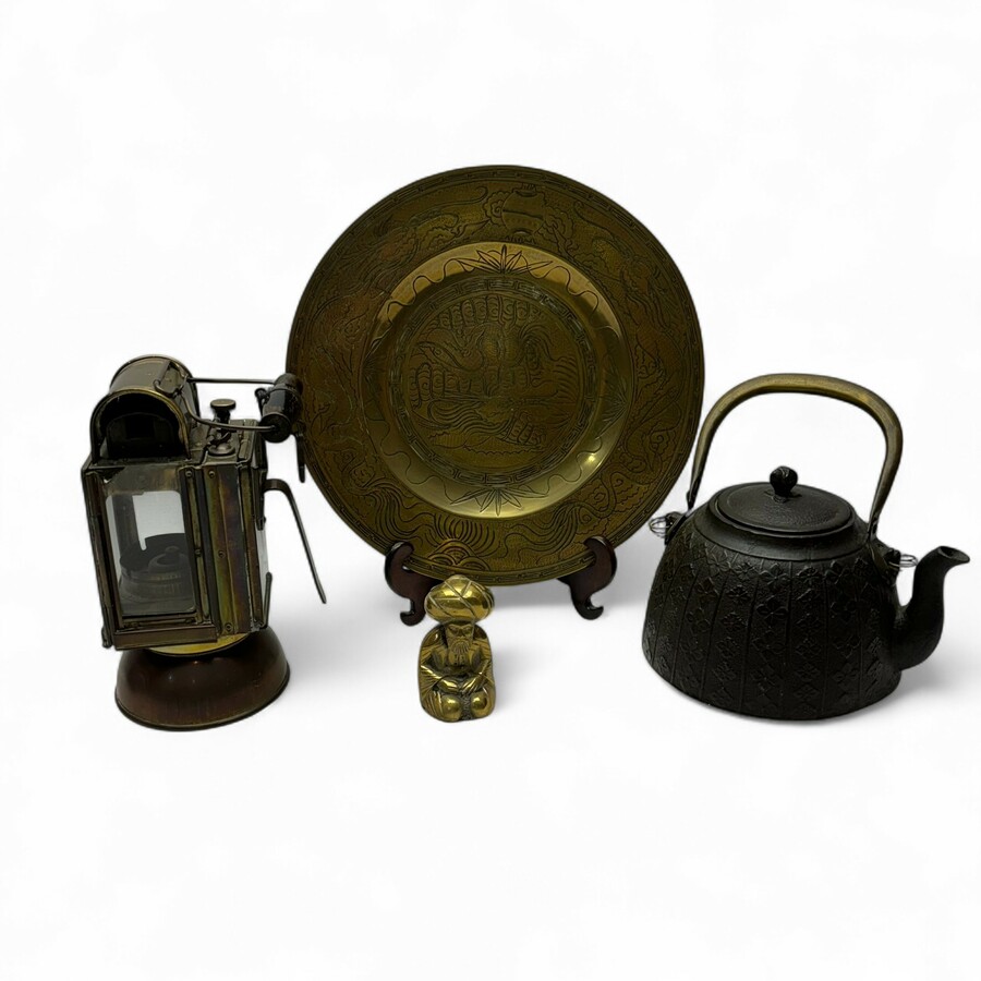 Lot met Europees en Oosterse messing artikelen. Bestaand uit een carbitlantaarn, schotel en een Japanse theeketel.