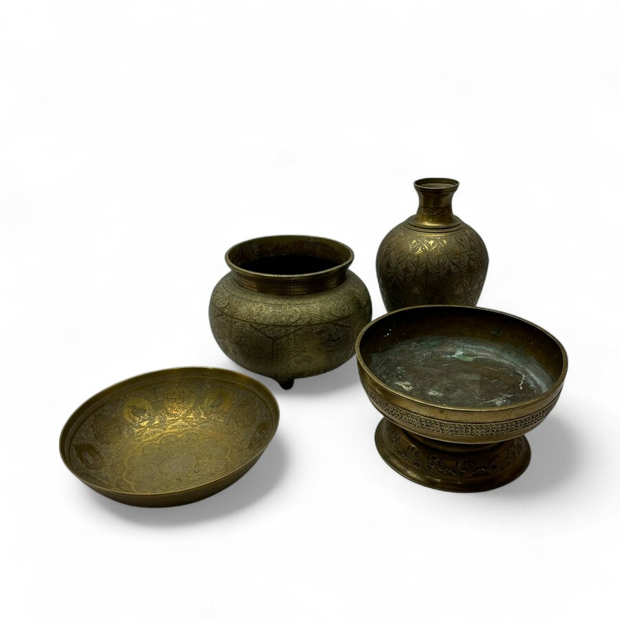 Lot met Indische messing, twee offerschalen, kogelpot en een vaas. Zeer fijn bewerkt met diverse versieringen. 20e eeuws.