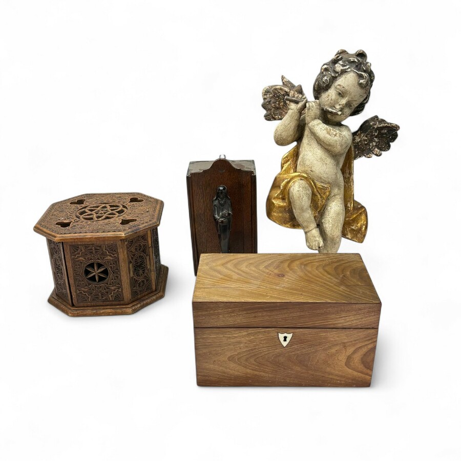 Lot diversen: een 20e eeuwse engel met vergulding, een 19e eeuws mahoniehouten kistje, een 19e eeuws houten kistje met schuifdeksel en greep in de vorm van een figuur, en een friese kerfsnee sto...