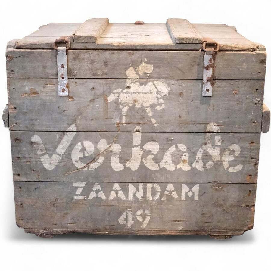 Een vroeg 20e eeuwse grote grijze houten kist, met zinken binnenzijde. Met opschrift 'Verkade Zaandam'.