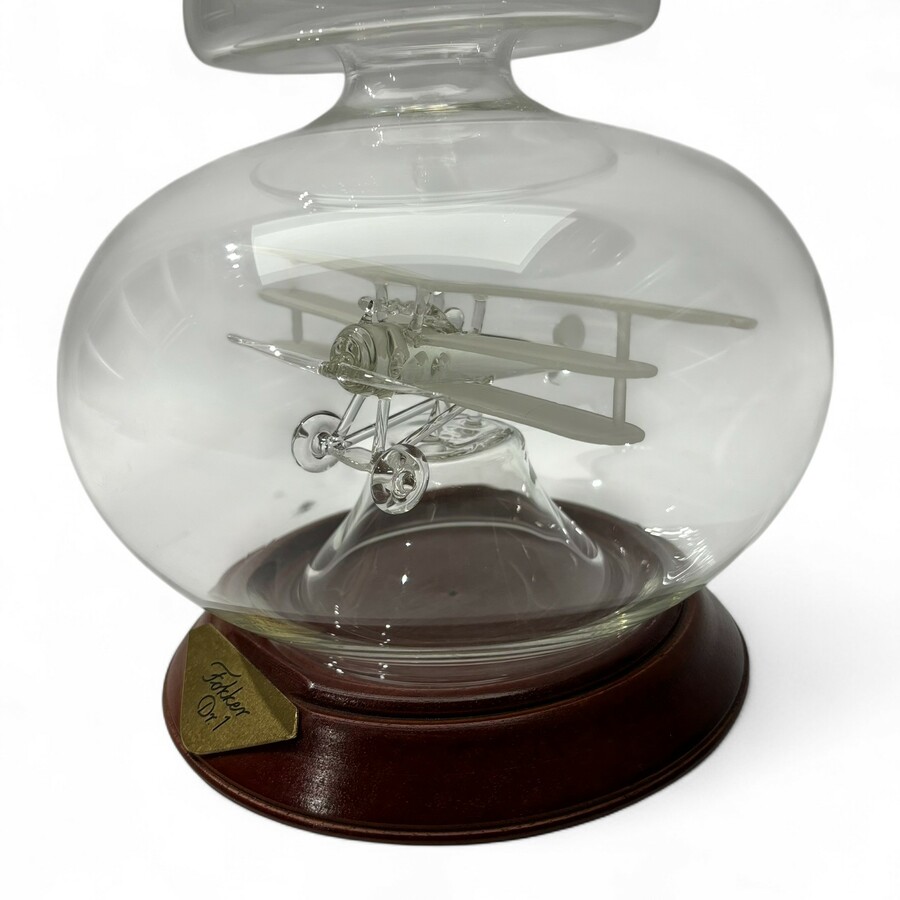 Een 20e eeuwse glazen karaf op houten basement, met in de karaf een glazen vliegtuig. Op basement gemerkt “Fokker DR 1”.