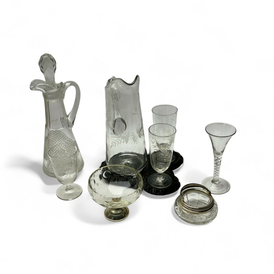 Lot divers glas en kristal, waaronder een antieke karaf met twee glazen, met geëtst decor van vogels, op houten onderstel, een 19e eeuws Boheems glas met decor van hert en een 19e eeuws kristall...