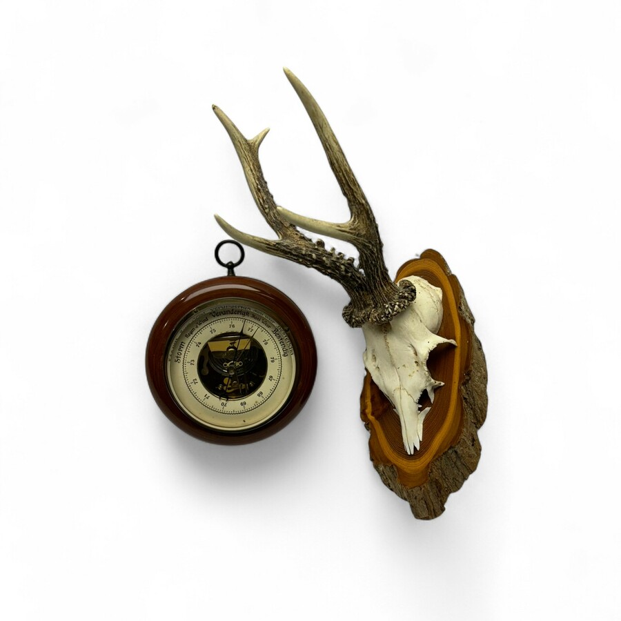 Lot divers: een 20e eeuwse wandbarometer en een ree gewei, gemonteerd op een houten schijf, met aan de achterzijde opschrift ‘St. Moritz 1976’.