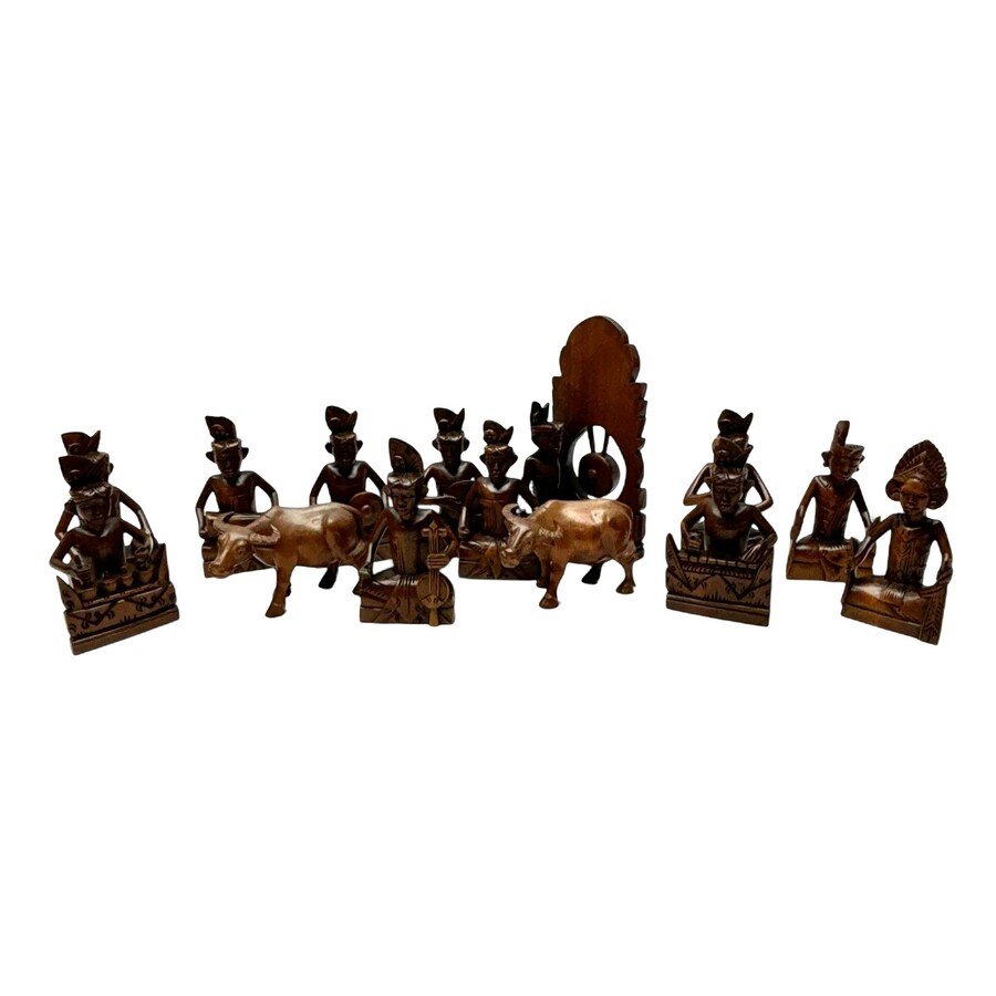 Lot diverse 20e eeuwse Indonesische houten sculpturen, orkest.