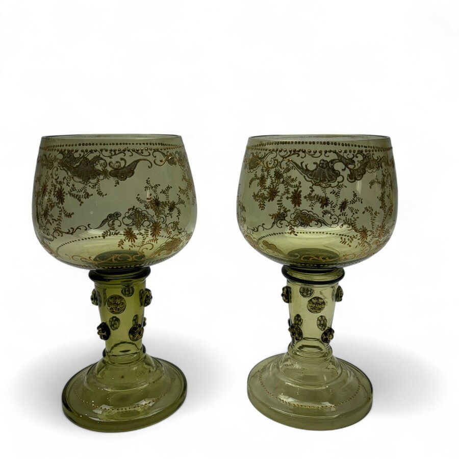Lot van twee antieke 19e eeuwse groenglazen bokalen, versierd met noppen en florale beschildering.
