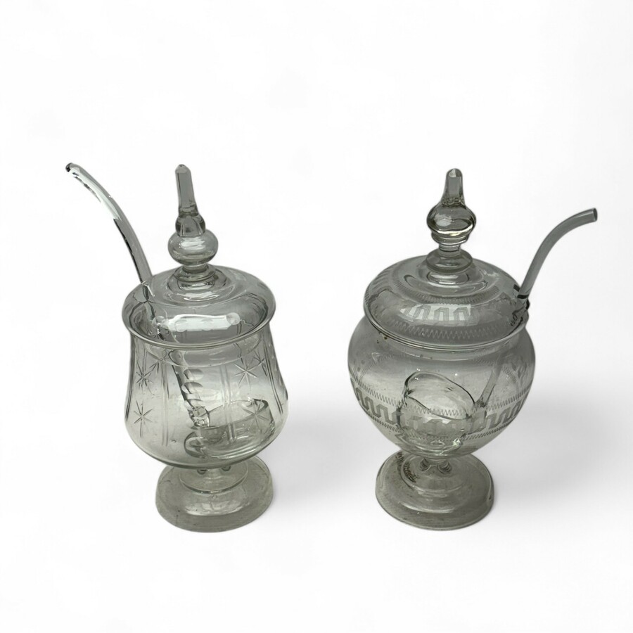 Lot van twee antieke laat 19e eeuwse kristallen bowl- of boerenjongenspotten, met opdienlepels.