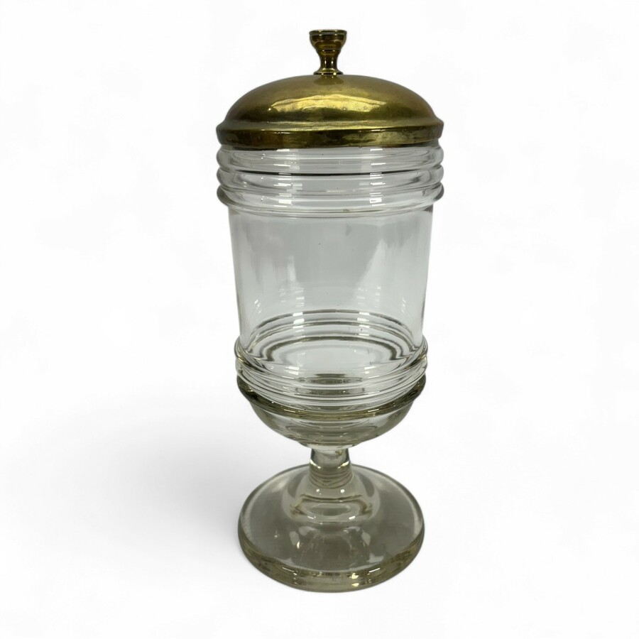 Een laat 18e of vroeg 19e eeuwse glazen apothekers pot zes ribben op een hoge voet, 24 cm hoog x 11 cm doorsnede. Zeer waarschijnlijk een bloedzuigerspot voor medische doeleinden. Messing deksel...