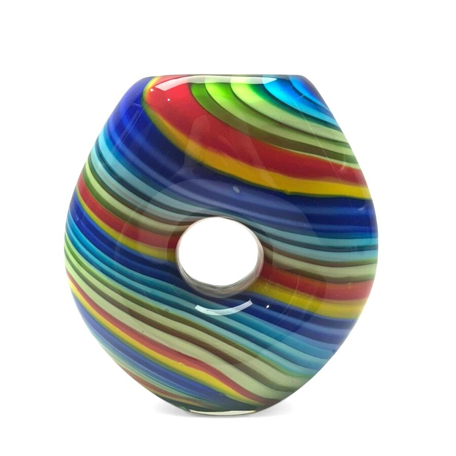 Een polychroom glazen doughnut vaas. Met een lijnen decor. 20e eeuws.