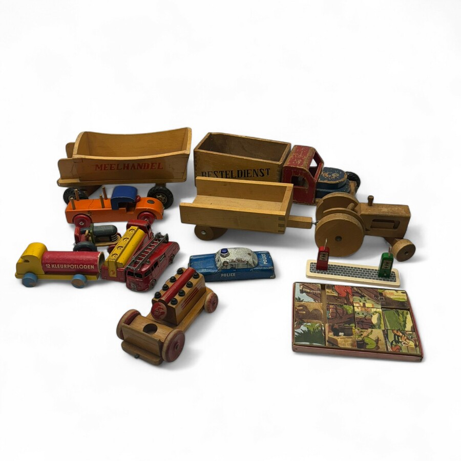 Lot met divers jaren 50 en 60 speelgoed. Bestaand uit houten vrachtwagens en tractors, puzzel, een blikken politie auto en twee Dinky supertoys.