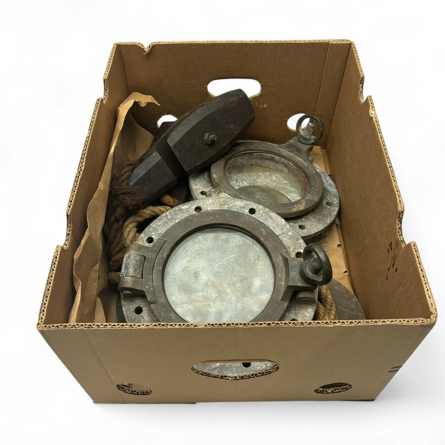 Lot met diverse scheepsartikelen. Bestaande uit katrollen, patrijspoorten en een bronzen schroef.