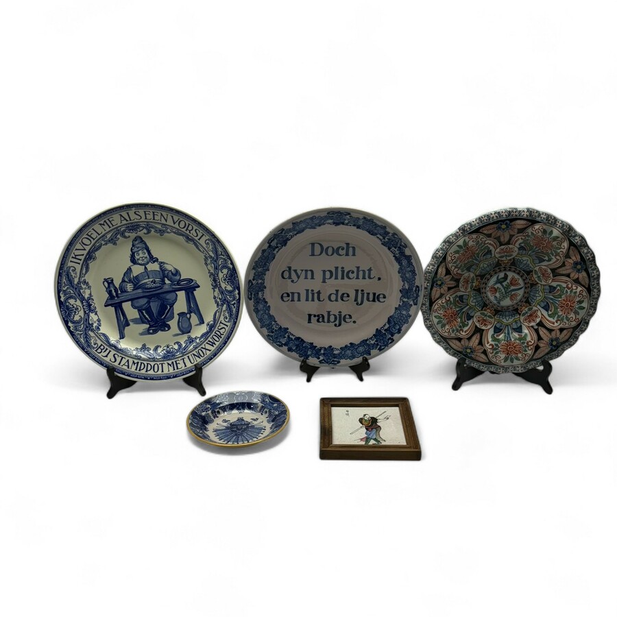 Lot van vier 20e eeuwse aardewerken schotels, waarvan twee en een tegel van Tichelaar, Makkum. Met daarbij een pauwschotel, naar antiek voorbeeld en Unox schotel van P. Regout, Maastricht.