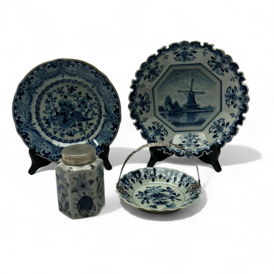 Lot divers blauw-wit aardewerk: een 20e eeuwse achtkantige schotel met decor van een molen, gemerkt Tichelaar Makkum, een Delftse theebus met tweede gehalte (835/1000) zilveren deksel, een Tiche...