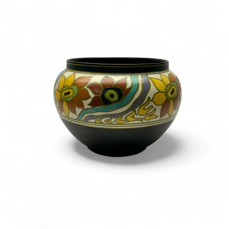 Een vroeg 20e eeuwse Gouds platelen cachepot, gedecoreerd met florale motieven. Aan de onderzijde gemerkt plateelbakkerij Zuid-Holland, decor Acam, ca. 1920.