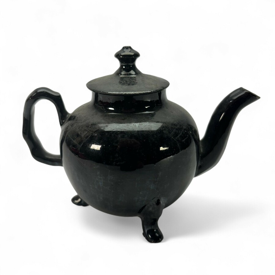 Een antiek 18e eeuws zwartgeglazuurd Engels keramieken theepotje op drie pootjes