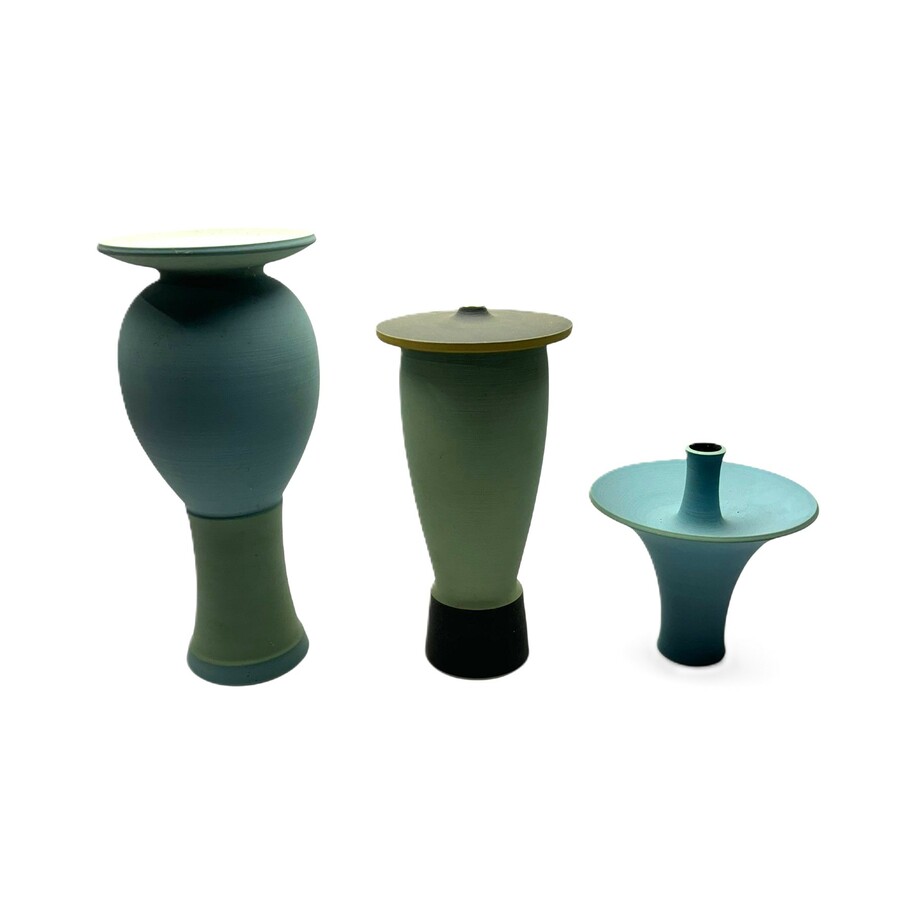 Lot van drie moderne keramieken vazen, steengoed/sinterengobe, twee in blauw en groen, één zwart, geel en groen. Allen gesigneerd Jan Dekker (Amsterdam, 1947) , Atelier de Gouden Hand Dokkum.