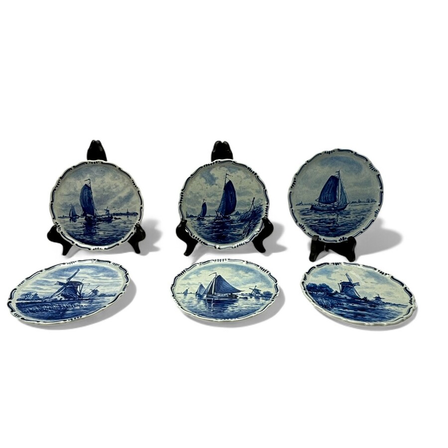 Lot van zes 20e eeuwse blauw-wit aardewerken bordjes met gecontourneerde rand. Diverse voorstellingen, molens en zeilschepen. Allen gemerkt Porceleyne Fles.