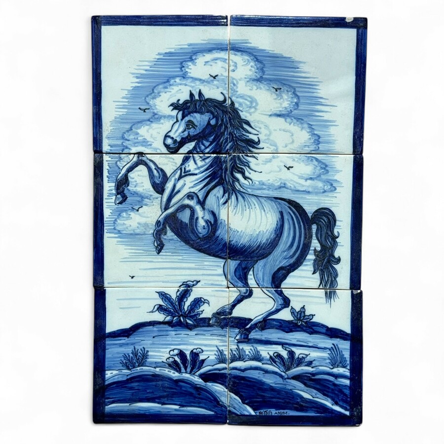 Een 20e eeuws blauw-wit tegeltableau, voorstelling van een steigerend paard. Aan de onderzijde gemerkt ‘molen’ en ‘Arum’ = Kees Molenhuis (Roden 1951 - Woudsend 1996).