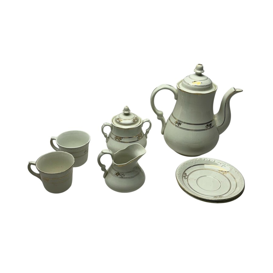 Een 20e eeuws theeserviesje met bloemdecor, bestaande uit theepot, kandijpot, melkkan en twee theekopjes met schotels. Gemerkt Regout, Maastricht.