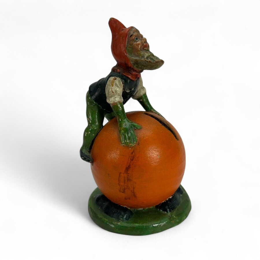 Een zeldzame antieke Duits pijpaarde/ aardewerken spaarpot, 18 cm hoog. In de vorm van een oranjebal met daarop een kabouter. Laat 19e of vroeg 20e eeuws. Gerestaureerd aan de kabouter.
