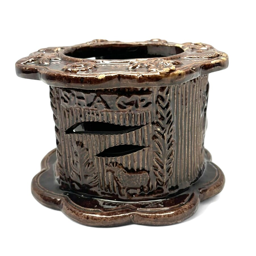 Een antiek Fries aardewerken theestoofje met testje, gelobte rand, aan de voorzijde met ooievaar en aan de zijkanten met tekst ‘’S Hage’