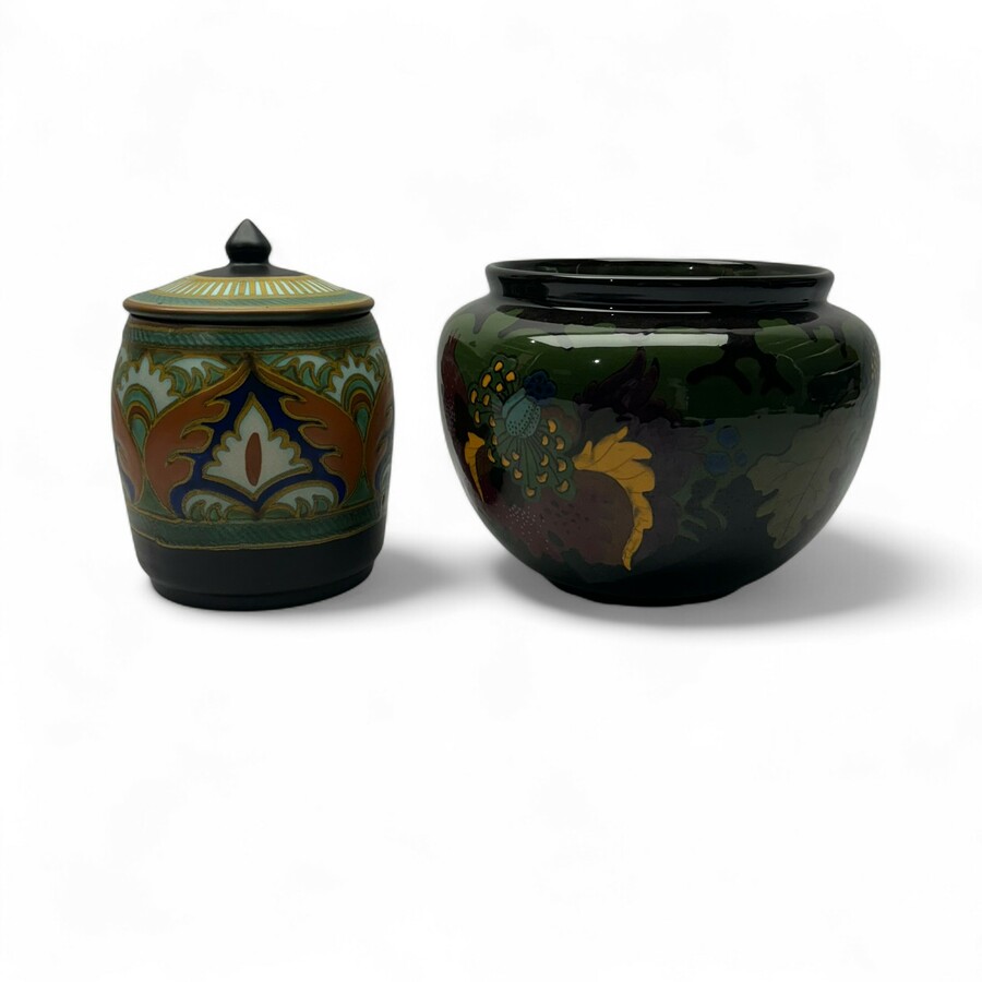 Een glans platelen cachetpot en een mat platelen tabakspot. Met rondom florale motieven. Gemerkt Arnhem en Zuid-Holland, Gouda.