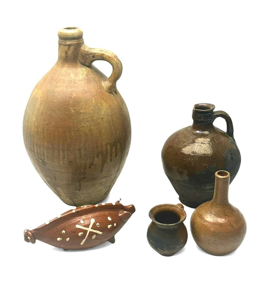 Lot van vier Duits steengoed kruiken, oorpotje en een fles. Hierbij een Fries aardewerken spaarvarken met ringeloor techniek gedecoreerd.