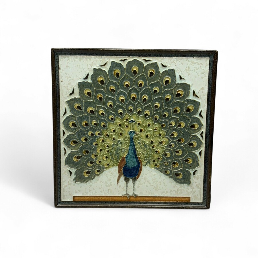 Aardewerk cloisonné wandtegel met polychroom decor van een pronkende pauw, gemerkt De Porceleyne Fles, Delft