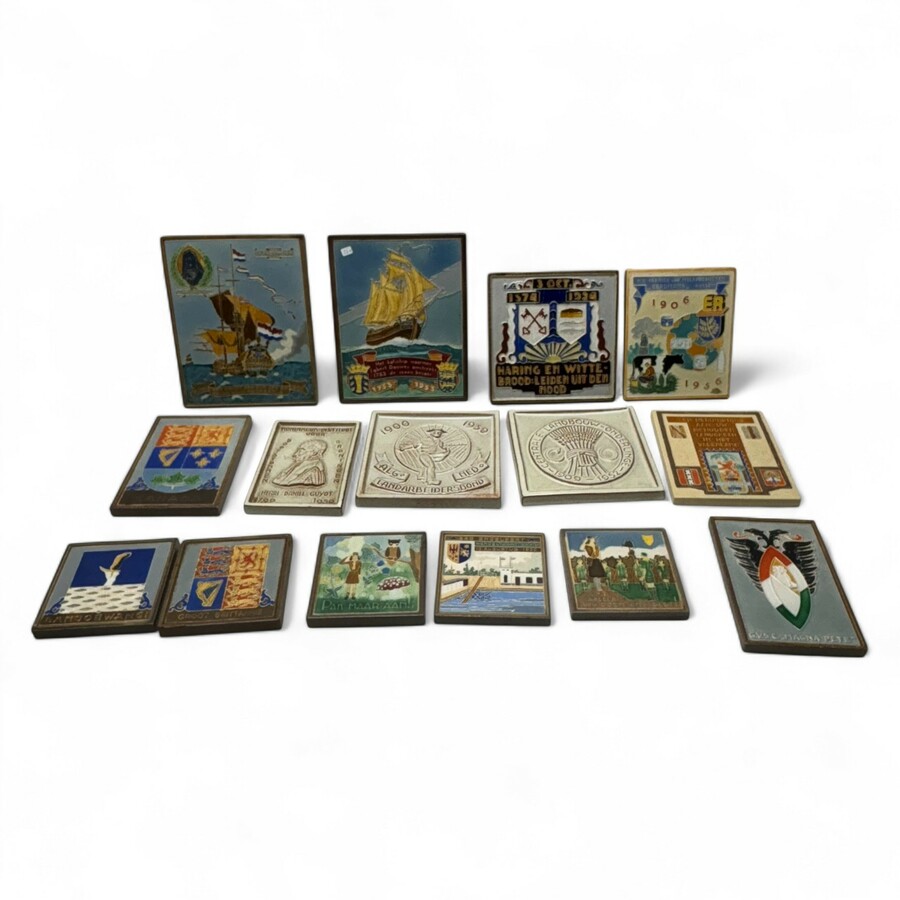 Vijftien diverse aardewerk cloisonné tegels, waaronder gedenk- en herinneringstegels: 'Haring en Witte-Brood: Leiden uit den Nood 1574-1924', en 'Band Nederland-Indië', alle gemerkt en uitvoerin...