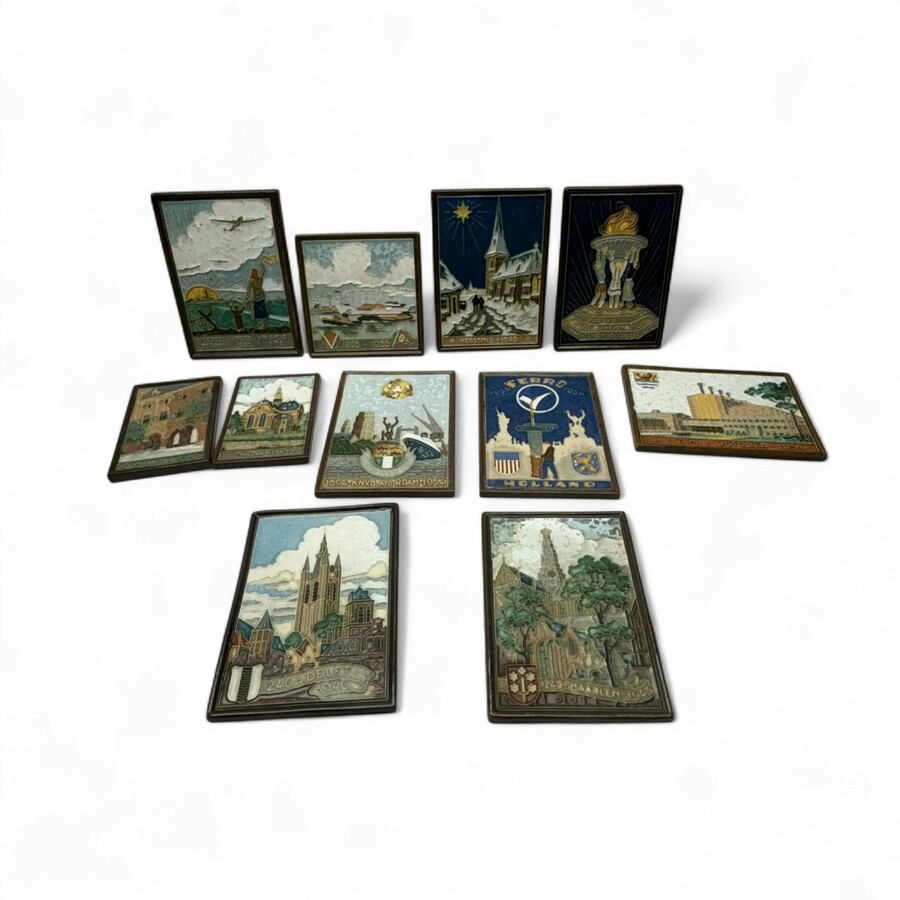 Lot van elf aardewerk cloisonné wandtegels, diverse thema's en decors, waaronder: twee tegels ter ere van 700 jaar stadsrechten in Haarlem en Delft, tegel met besneeuwd dorpsgezichtje 'Kerstmis ...