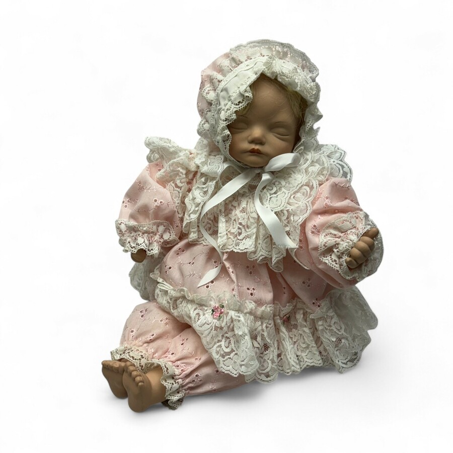 Pop van een slapende baby, met licht roze pyjama en slaapmuts, afgezet met kant: 'My Princess', het hoofdje en de ledematen van porselein, gemerkt, ontwerp en uitvoering Joyce Wolf Sculpture, En...