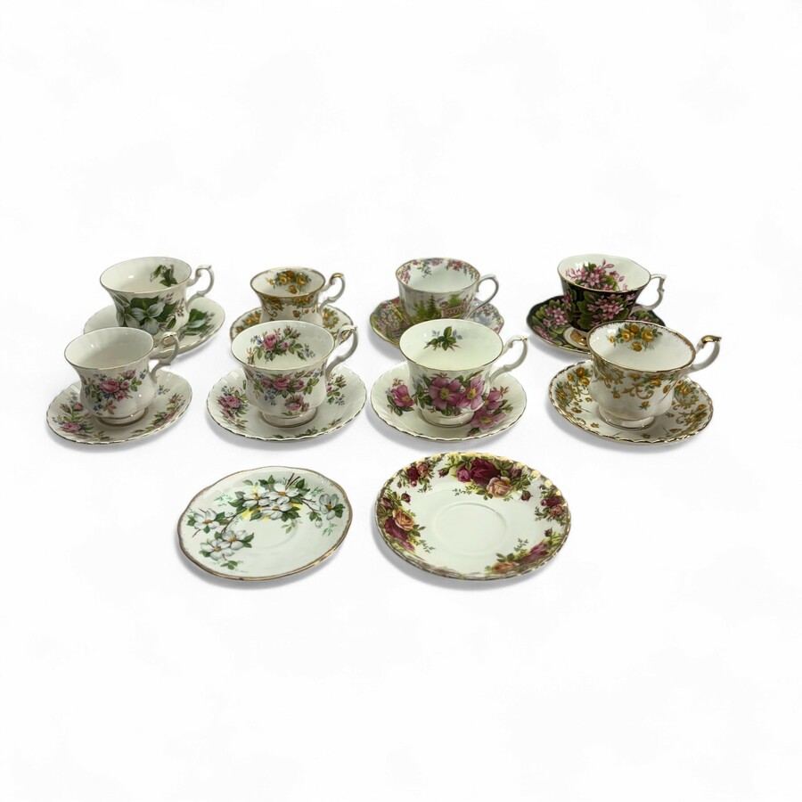 Lot van acht 20e eeuwse porseleinen kop en schotels, allen gemerkt Royal Albert. Diverse decors.
