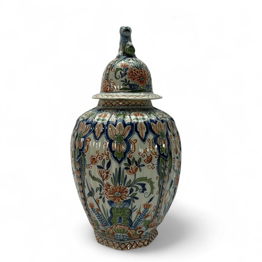 Een achtkantige vroeg 20e eeuwse polychroom beschilderde Tichelaar dekselvaas. Decors van bloemen en vogels, bekroond met tempelleeuw. Aan de onderzijde gesigneerd met gekruiste T’s.