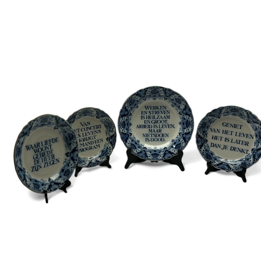 Lot van vier 20e eeuwse aardewerken spreukborden, met handbeschilderd blauw-wit decor met diverse spreuken: ‘Waar woont Gebiedt de heer zijn zegen’, ‘Geniet van het leven het is later dan je den...