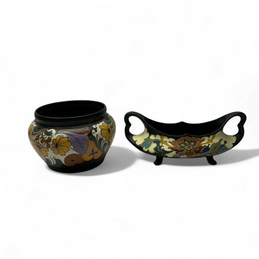 Lot van twee stuks plateel: een jardiniere, gemerkt Regina Gouda, model Rosario, en een cachepot, gemerkt Eskaf, modelnr. 664.