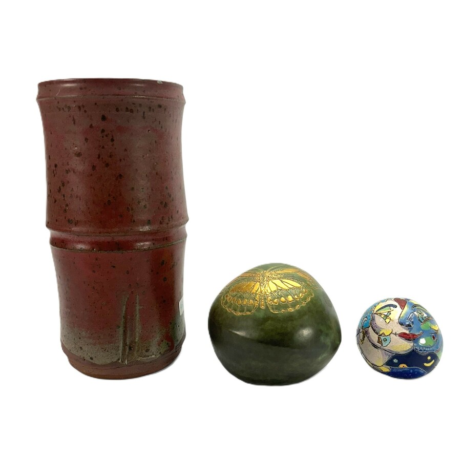 Een 20e eeuwse keramieken vaas, rood glazuur. Met monogram 'KH' = Kees Hoogendam (Den Haag, 1941). Met daarbij twee bollen, gesigneerd Ellen Dubach.