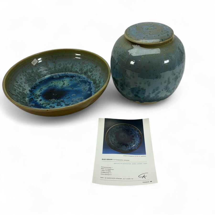 Een 20e eeuwse keramieken dekselpot en schaal met kristalglazuur, beide gemonogrammeerd 'GK' = Gijs Kraan, pottenbakkerij Kerargil Nijelamer. Gedateerd 2008.