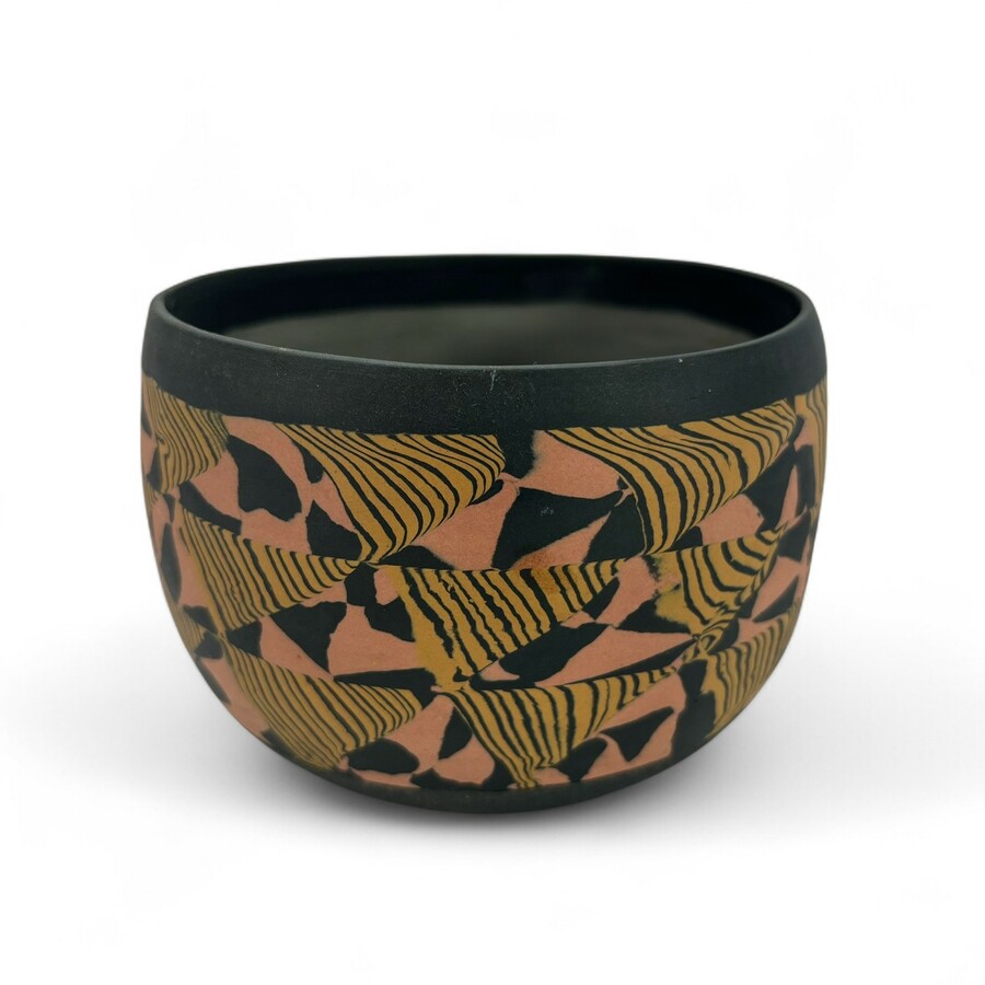 Een 20e keramieken schaaltje, opgebouwd uit verschillende stukken gekleurde klei. Aan de onderzijde gesigneerd Judith de Vries (Leiden, 1957)