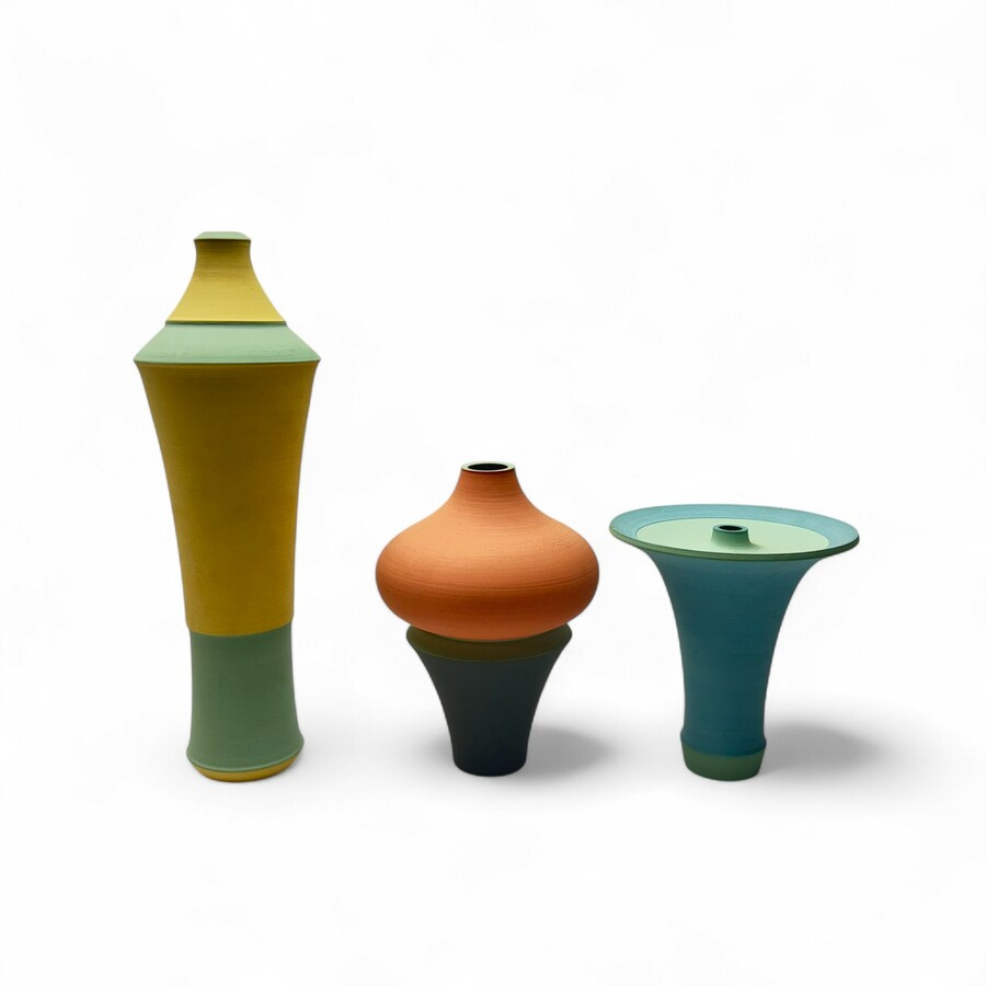 Lot van drie moderne keramieken vazen, steengoed/sinterengobe, één in blauw en groen, één in rood, zwart en blauw en één in geel-groen. Allen gesigneerd Jan Dekker (Amsterdam, 1947) , Atelier de...