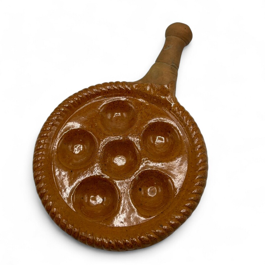 Een antieke 19e eeuwse geglazuurd aardewerken poffertjes- of evenveeltjespan.