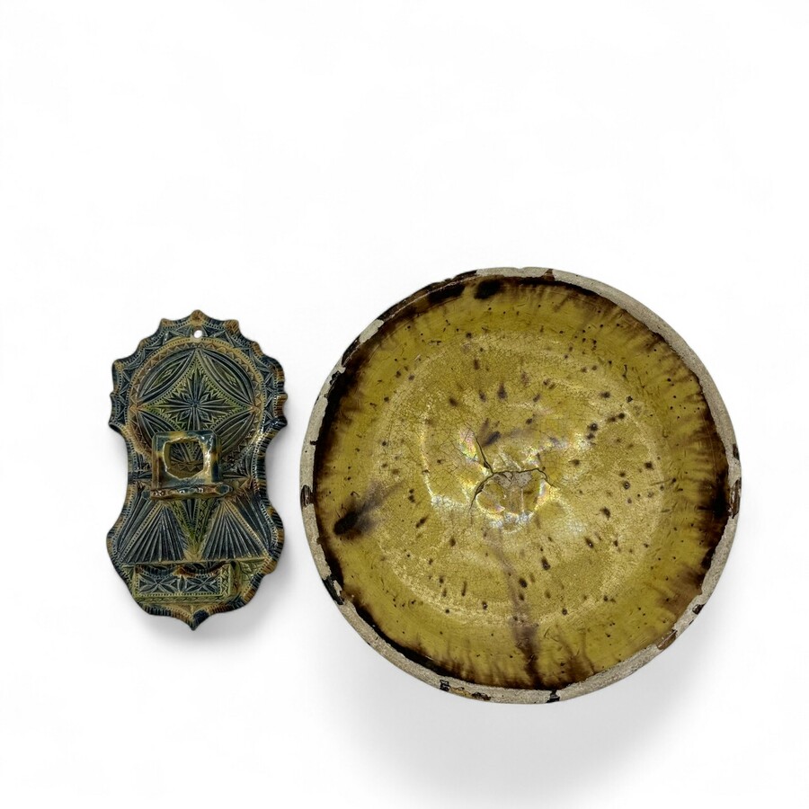 Lot van twee stuks Fries kerfsnee aardewerk: een luciferdoosjehouder voor aan de wand en een schaal, aan de onderzijde gemerkt F. Hoekstra. Conditie: luciferhouder gelijmd.