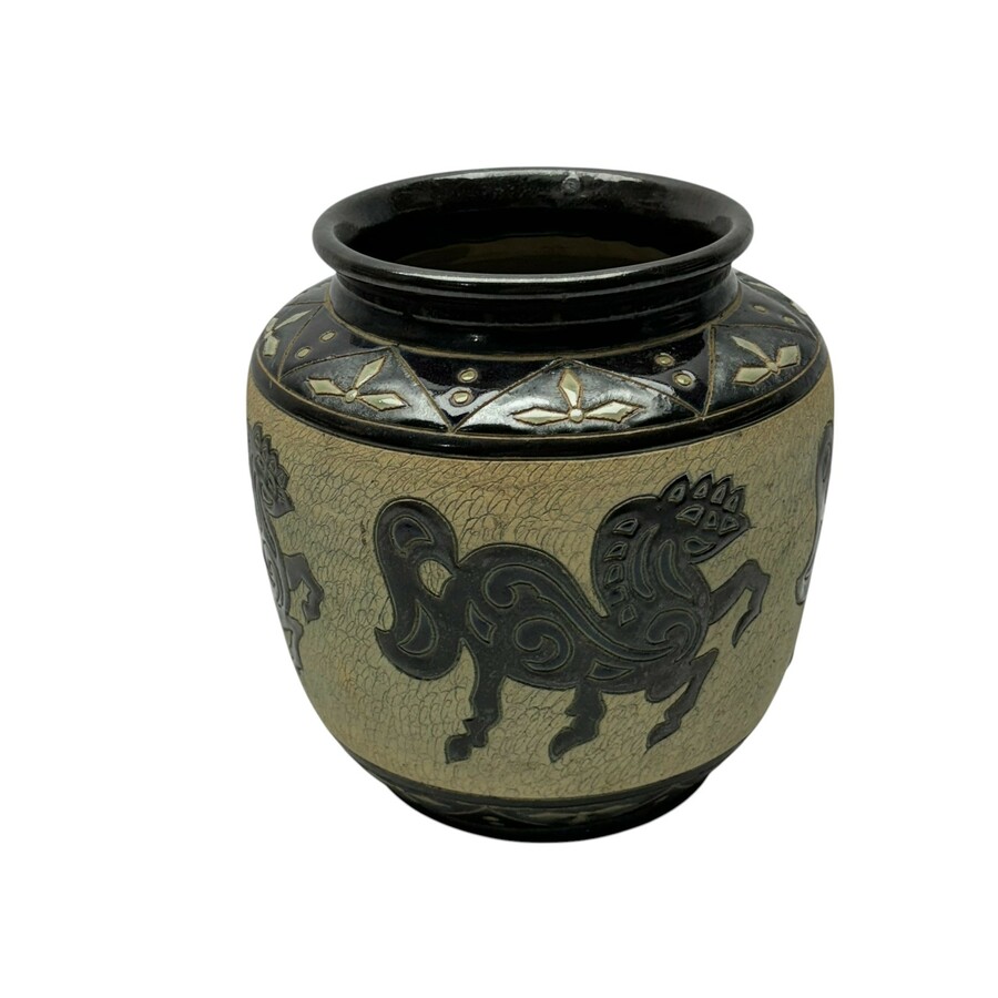 Een 20e eeuwse aardewerken vaas met decor van paarden. Maker onbekend, de stijl van Jan Eisenloeffel voor plateelbakkerij de Distel, ca. 1910.