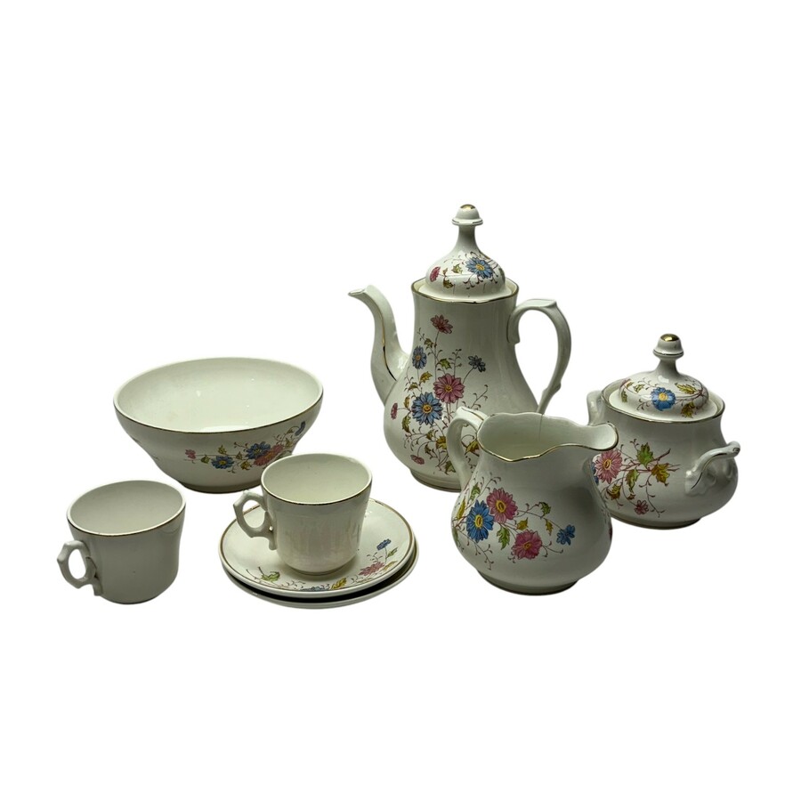 Een 20e eeuws theeserviesje met gouden bies en bloemmotieven, bestaande uit theepot, spoelkom, kandijpot, melkkan en twee theekopjes met schotels. Gemerkt Societe Ceramique.