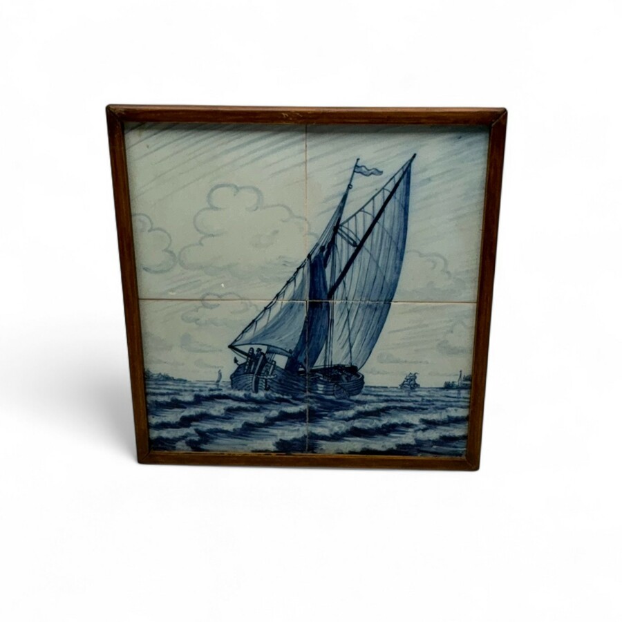 Lot van drie 20e eeuwse blauw-wit aardewerken vierpas tegeltableaus met decor van zeilschepen. Eén gesigneerd TF = Tineke Fahner, schilderij bij Tichelaar Makkum. In houten lijstjes.