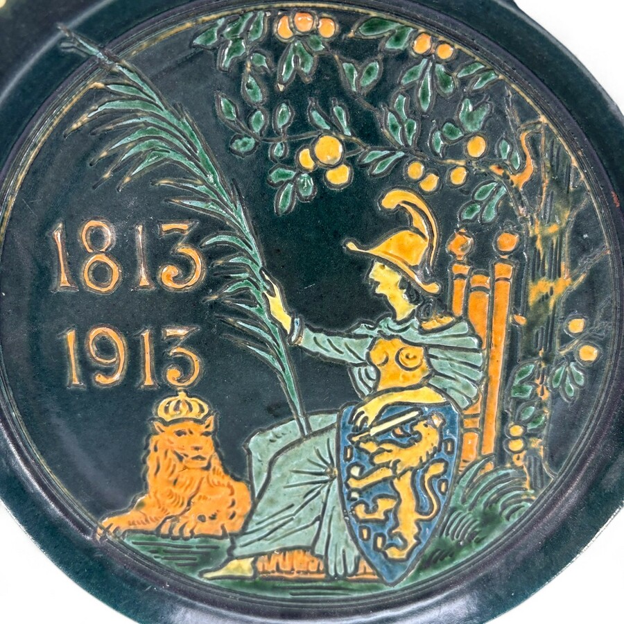 Een aardewerken Mobach schotel met ringekoor techniek, 32 cm doorsnede. "Onder den Oranjeboom, Rust ik veilig" 1813-1913. Gedraaid door Bouke I en decoratie door Klaas II uit 1913.